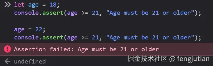 console.assert(age >= 21, "Age must be 21 or older"); // No output because the condition is true
