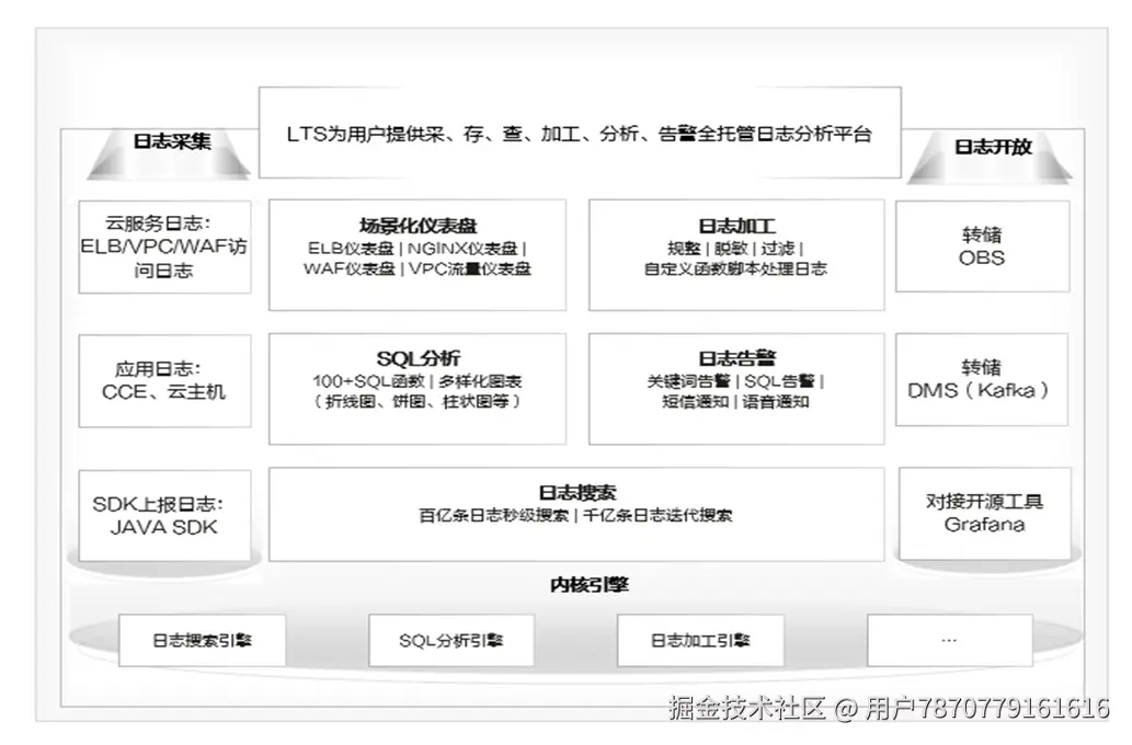 LTS提供解决方案参考如下图1,可以实现统一收集生产环境应用日志,开发人员检索分析日志,运维人员基于日志配置告警,实时感知现网业务,及时发现并解决故障问题。