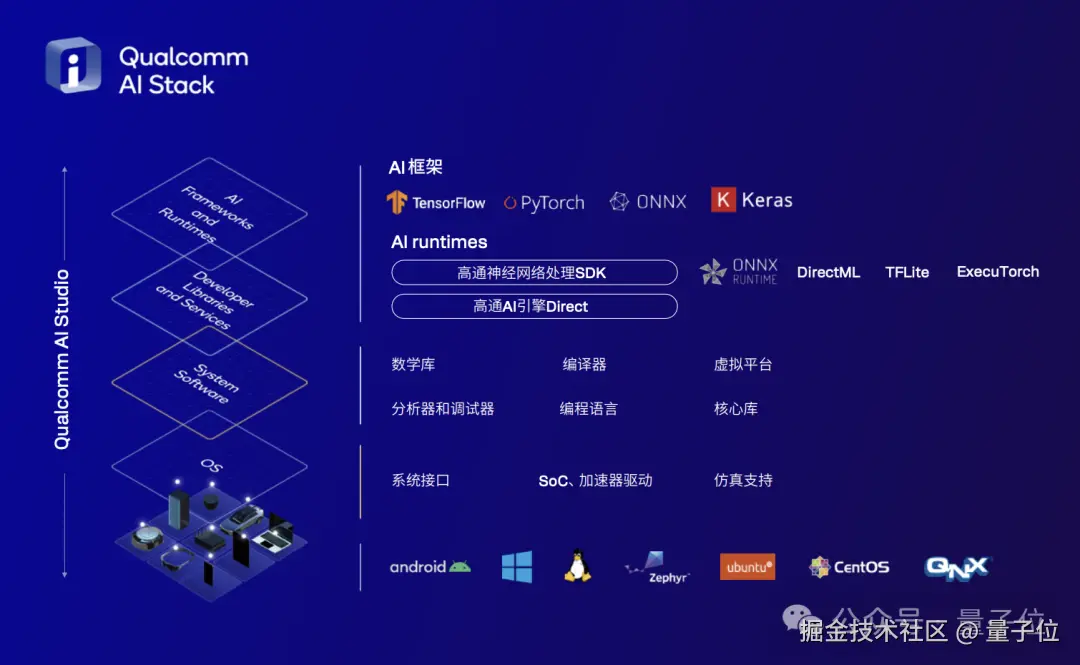 更早之前高通推出的 AI 软件栈(AI Stack),还全面支持主流 AI 框架(如 TensorFlow、pytorch、ONNX 和 Keras)和 runtime(如 TensorFlow Lite、TensorFlow Lite Micro、ExecuTorch 和 ONNX runtime),能帮助开发者进一步加快开发流程。