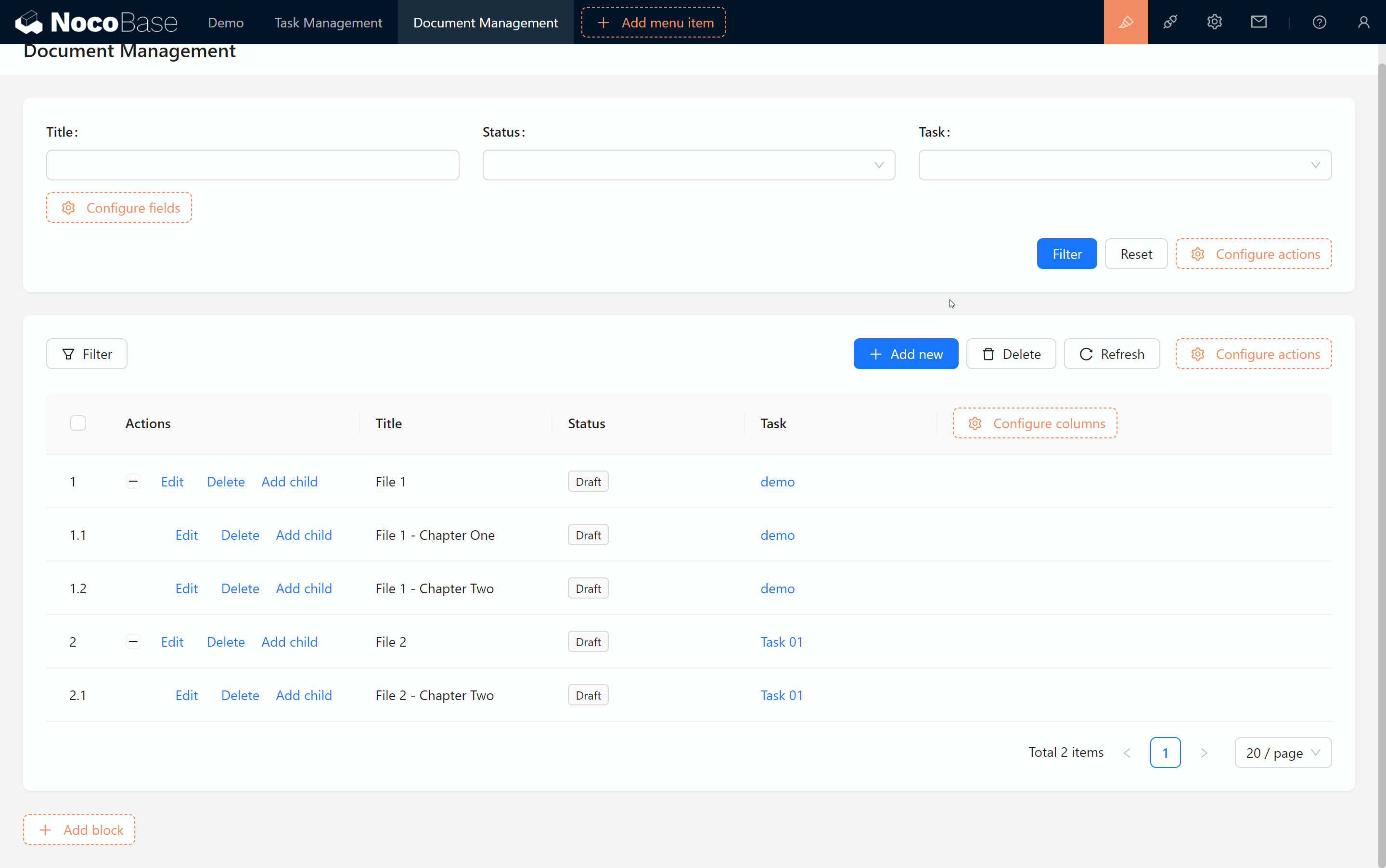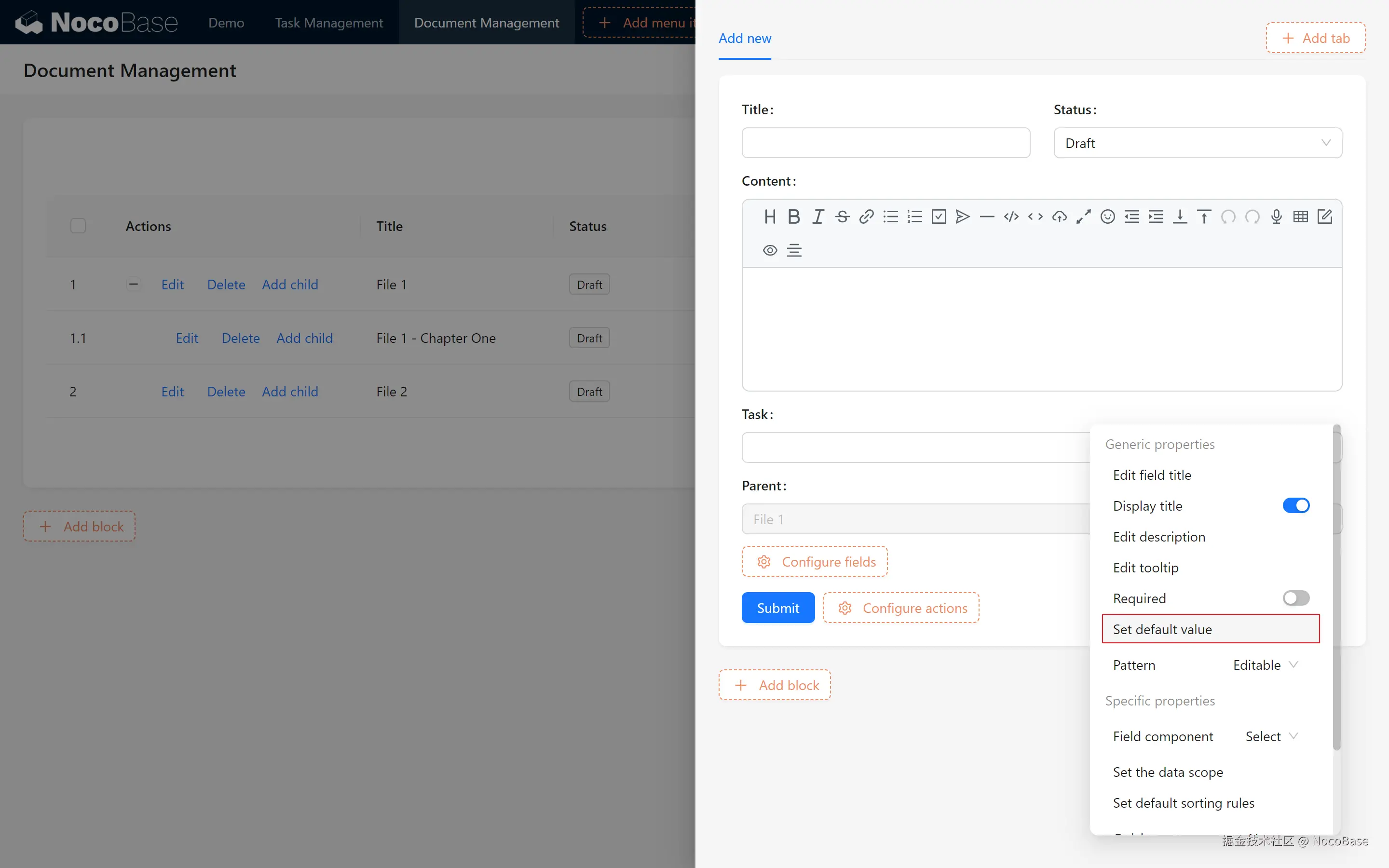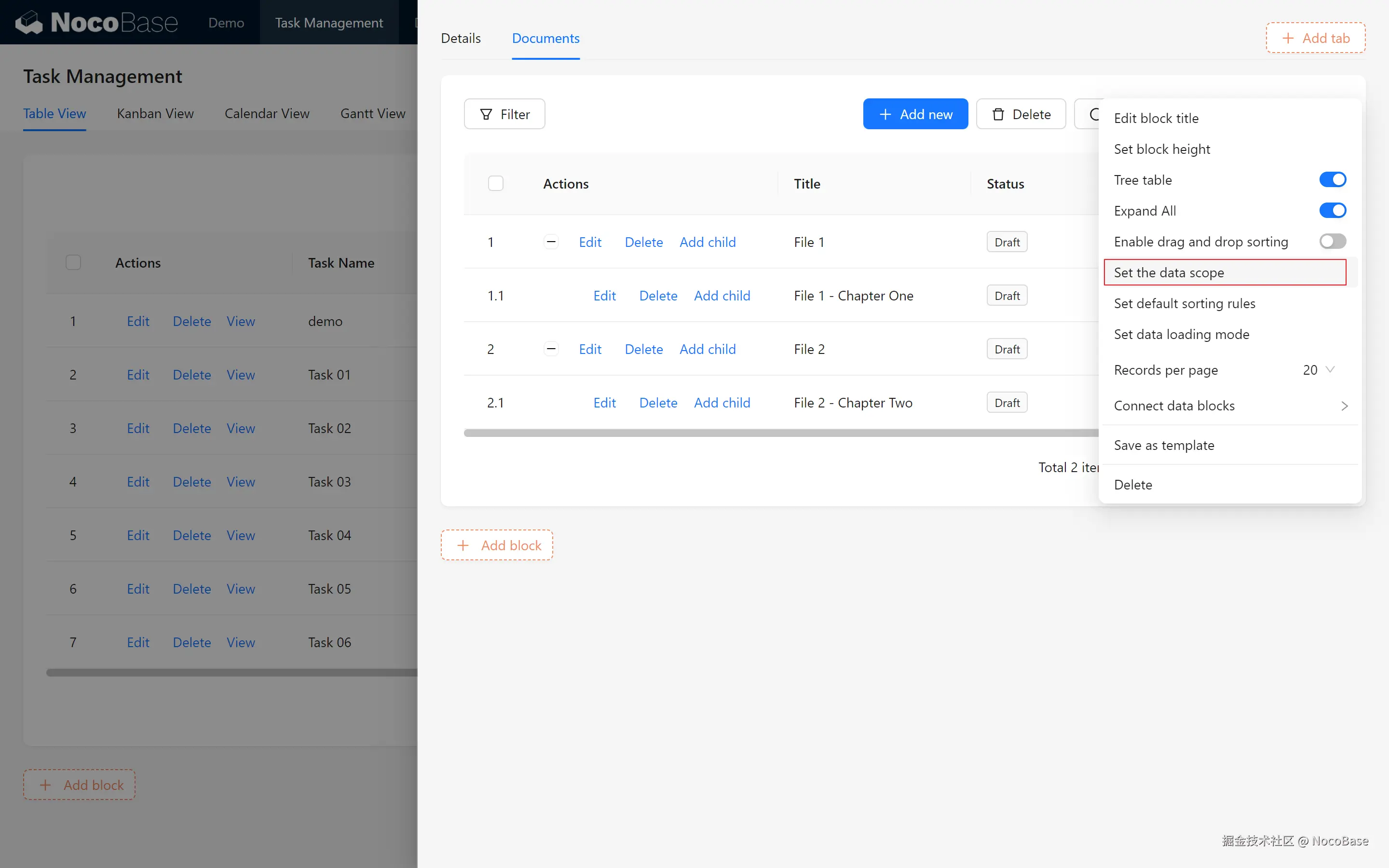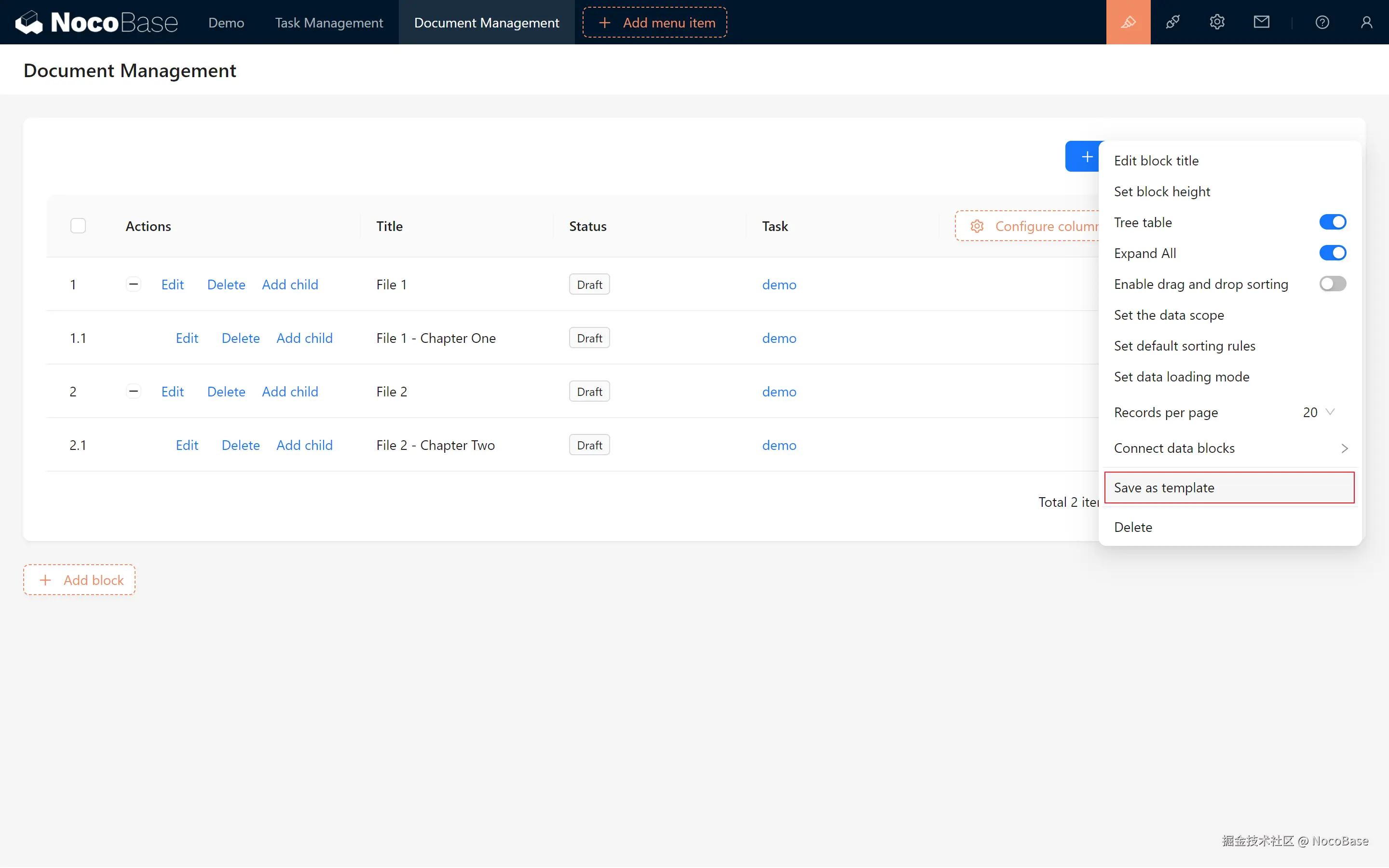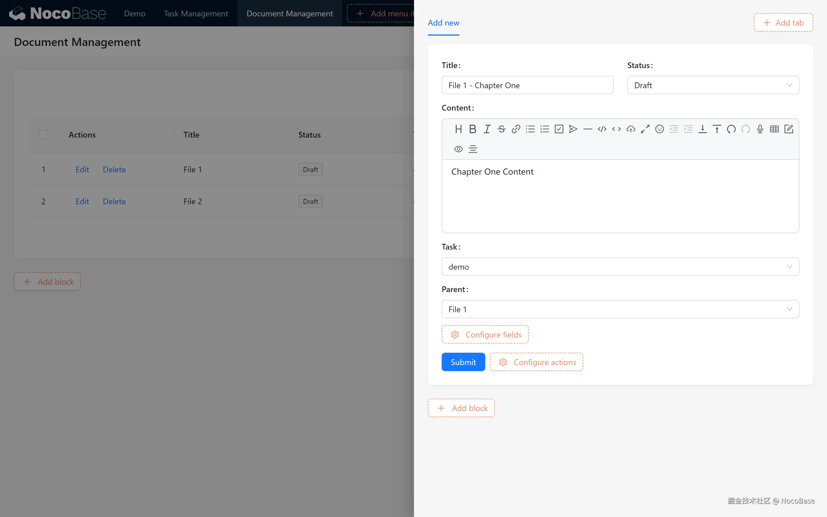 在本章中,我们创建了一个基本的知识库,包括文档表、树形结构和与任务的关联展示。通过为文档添加筛选区块和模板复用,我们实现了高效的文档管理。