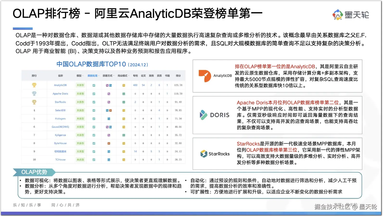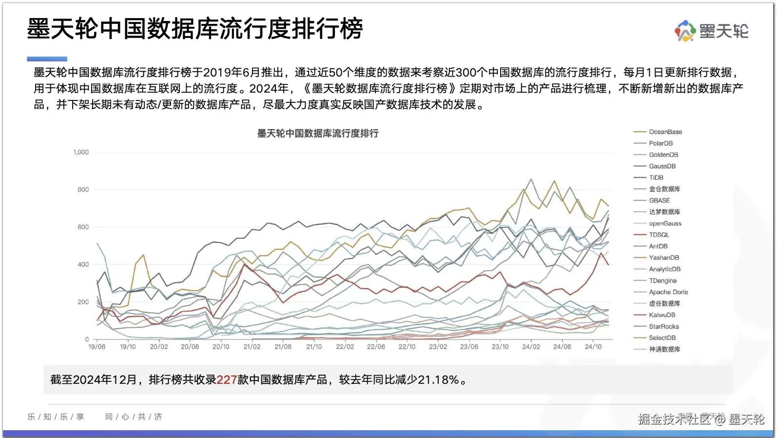 回顾整年,数据库排行榜持续波动:OceanBase与PolarDB交替登顶,前三甲的位置也不断迎来新晋挑战者。最新一期中GoldenDB凭借技术创新与市场积淀成功跃升至第三位;3家初创厂商通过不同的创新路径崭露头角:DolphinDB聚焦数字金融领域,Kyligence专注大数据分析,而MatrixOne则通过AI和智能数据管理开辟新赛道。