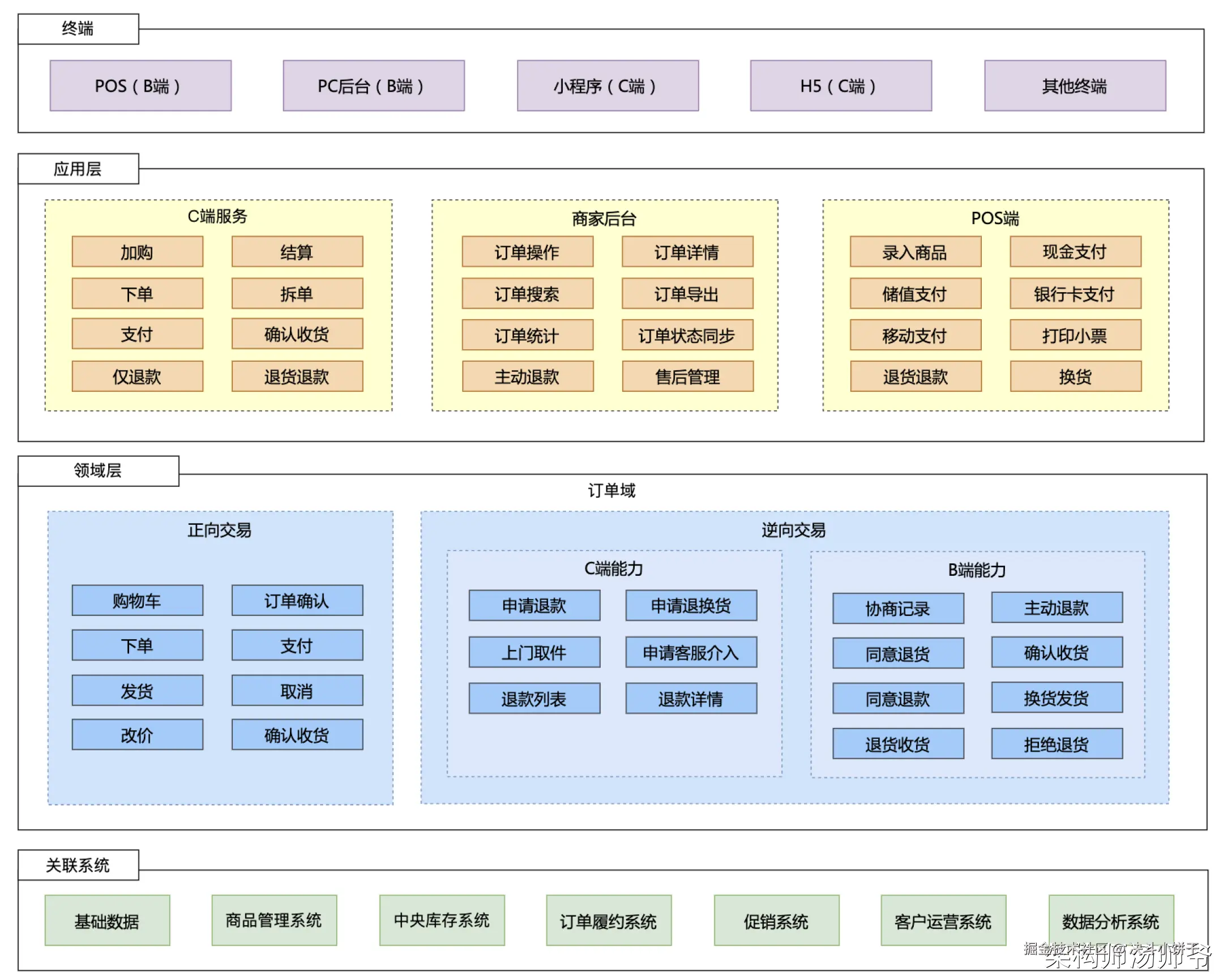 线上线下交易系统的应用架构包括终端、应用层、领域层和关联系统。