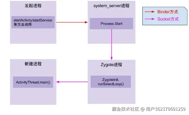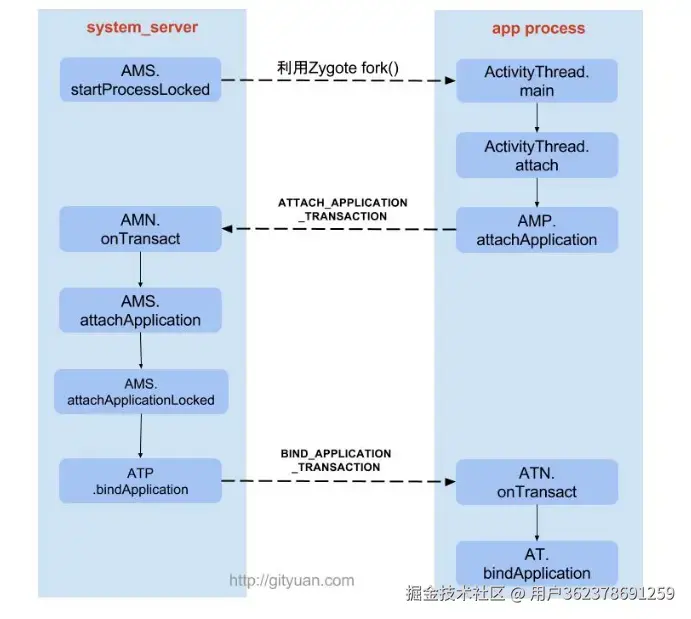 App与AMS通过Binder进行IPC通信,AMS(SystemServer进程)与zygote通过Socket进行IPC通信。后面具体介绍。