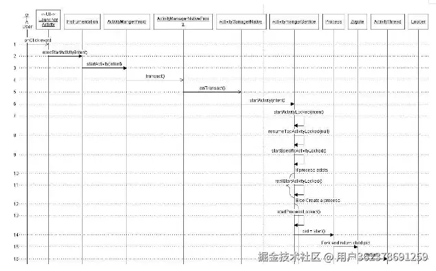 ①App发起进程:当从桌面启动应用,则发起进程便是Launcher所在进程;当从某App内启动远程进程,则发送进程便是该App所在进程。发起进程先通过binder发送消息给system_server进程;