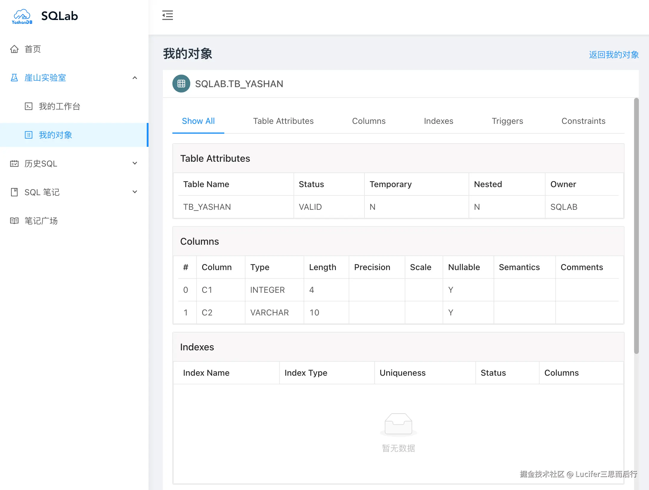 SQLab 会为每一个登录的用户分配一个后台数据库。您可以在工作台中通过执行 SQL 在数据库中创建表对象,插入数据等,也可在我的对象界面查看数据库中已有的表,约束,索引等对象。