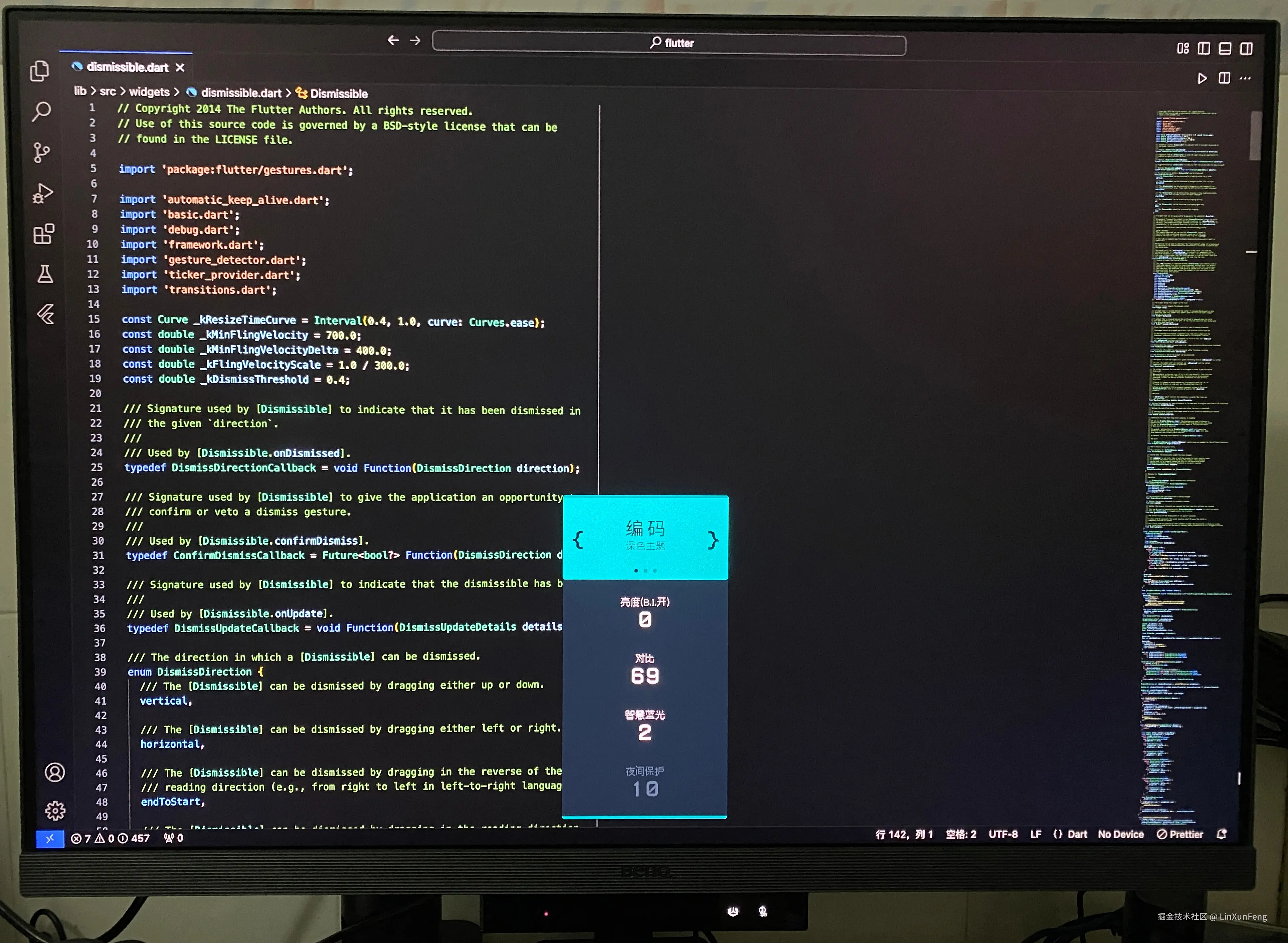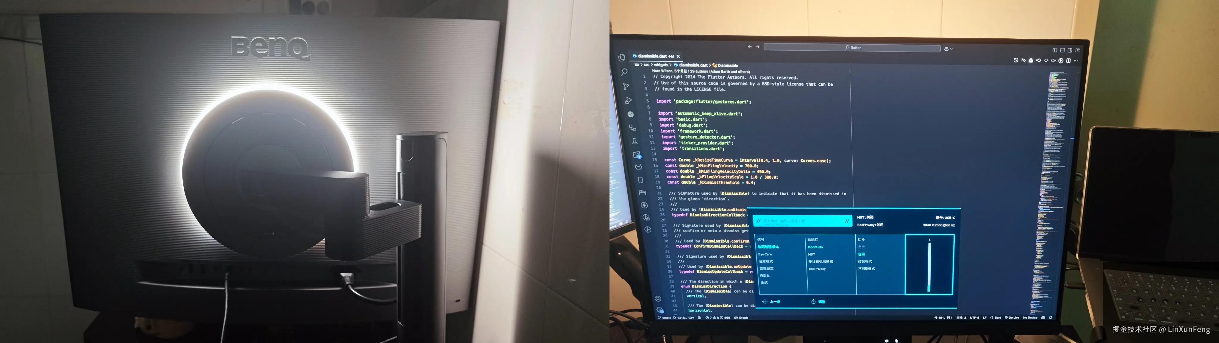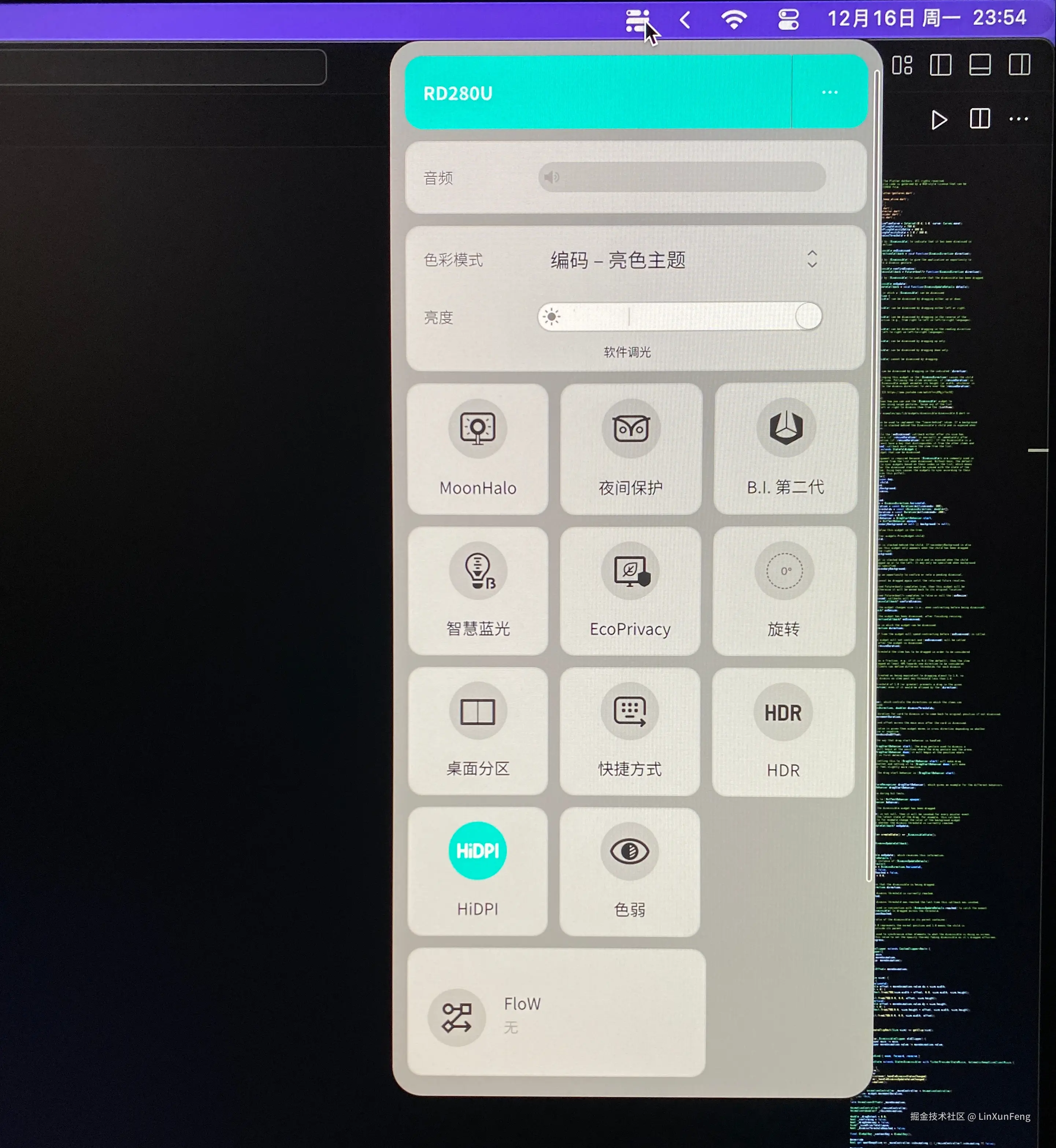 另外,这款专业编程显示器,还提供了亮色与深色两种主题模式,对于 IDE 的浅色和深色主题,使用相应的主题模式,会有很好的加成效果,如图: