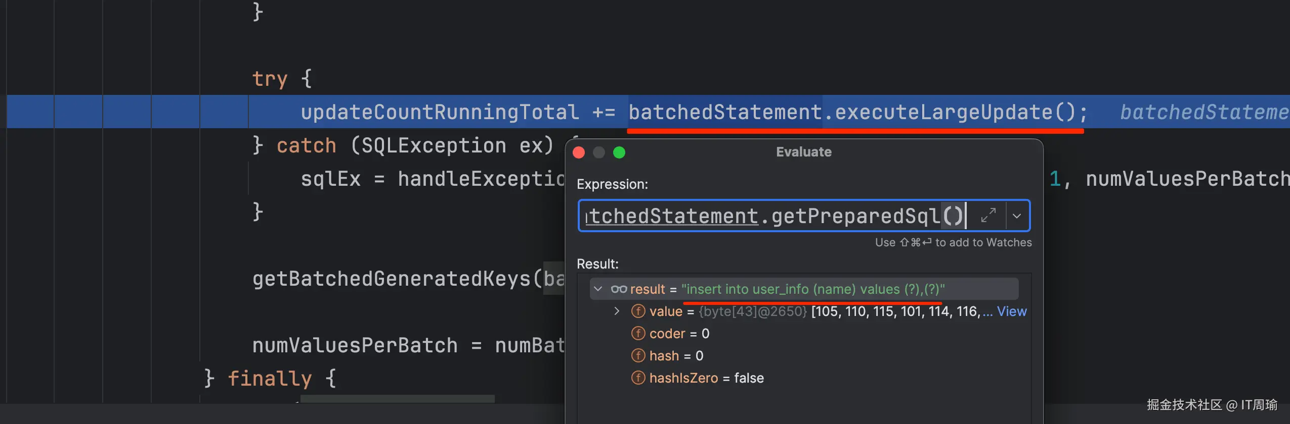 现在这行代码就是在执行改写后的SQL,通过debug可以看到改写后的SQL为:insert into user_info (name) values (?),(?),也就是把两个insert合并为了一个insert,这样自然就能提高执行性能了。