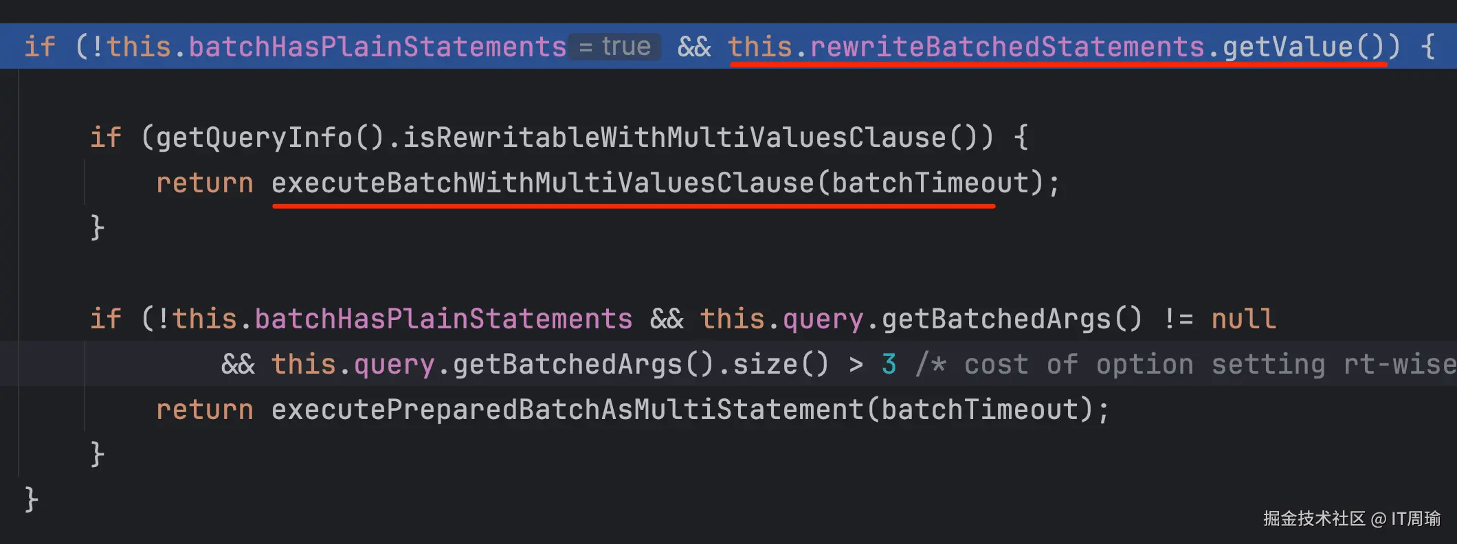 而执行preparedStatement.executeBatch();最终会执行ClientPreparedStatement中的executeBatchInternal()方法,其中就会判断rewriteBatchedStatements是否true,如果为true,就会执行改写后的SQL(multi values)