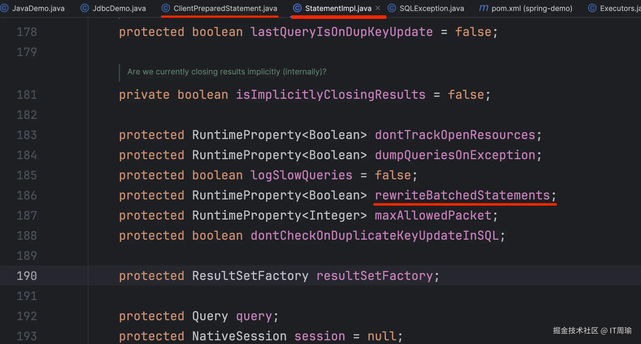 通过源码可以证明,在执行preparedStatement.executeBatch();时,底层对应的是ClientPreparedStatement,而它的父类为StatementImpl,其中就有一个rewriteBatchedStatements属性