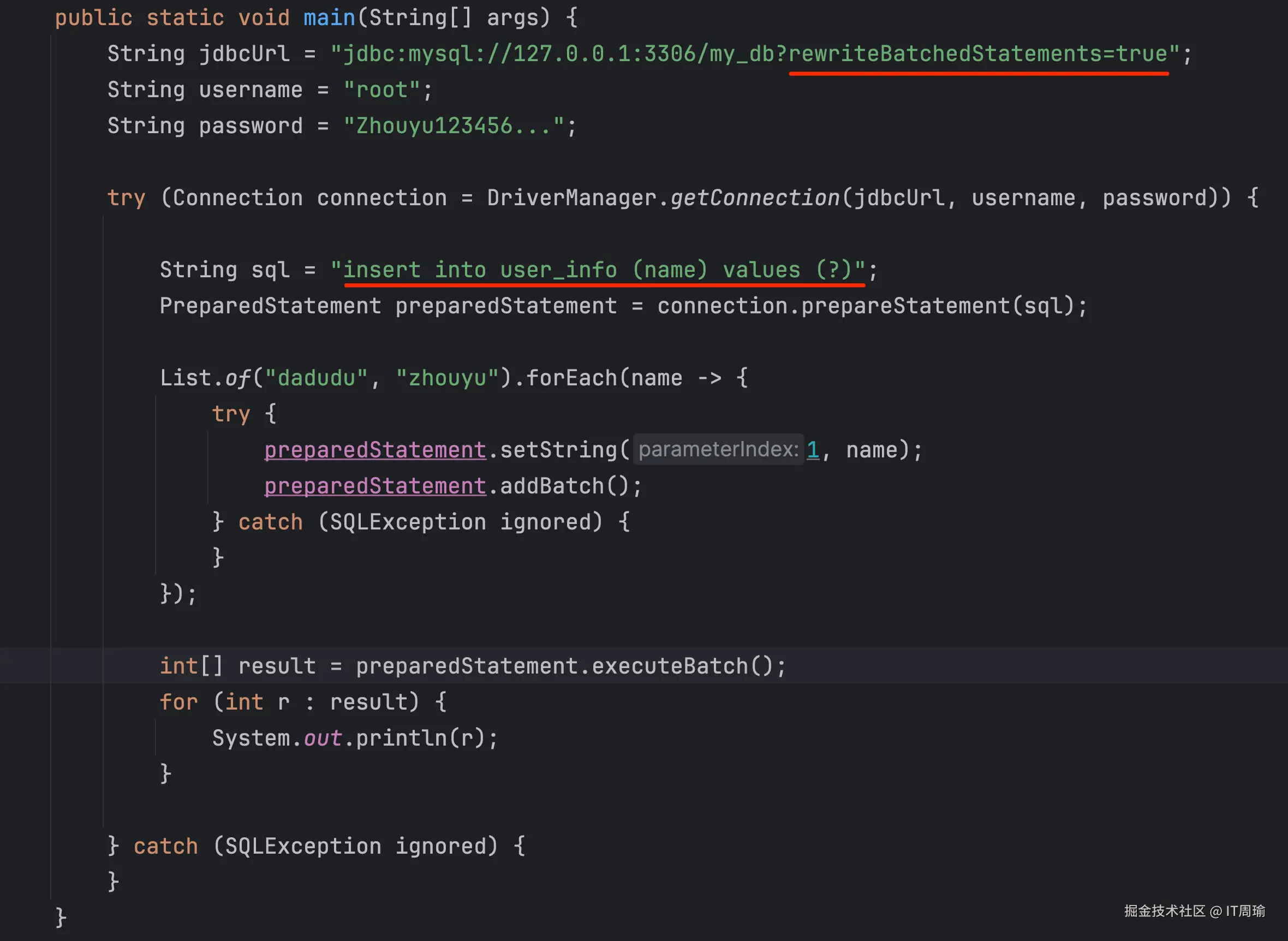 但如果rewriteBatchedStatements改为true,那么以上代码就只会执行一次insert: