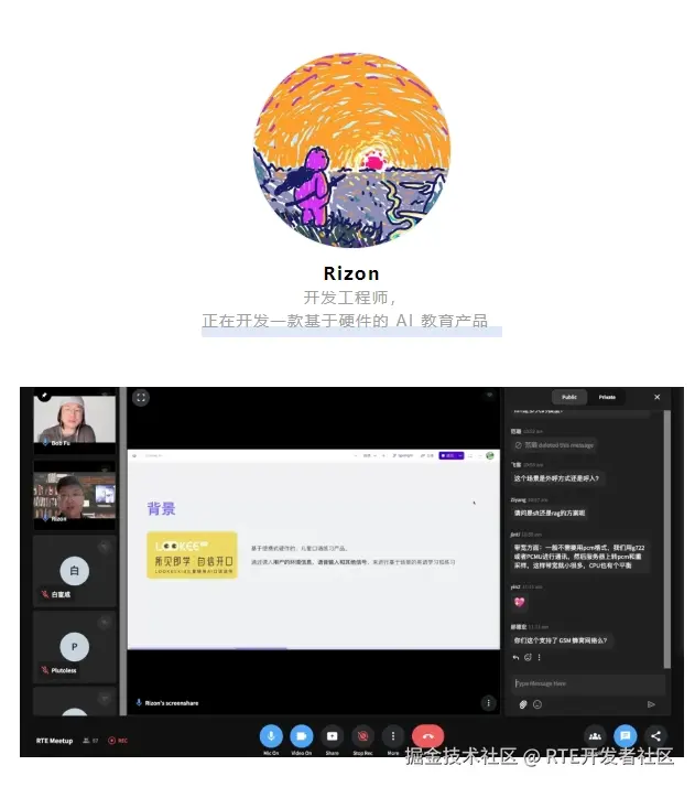 Real-Time&Real Connection,RTE Meetup 是 RTE 开发者社区发起的小型开发者聚会,邀请开发者分享技术和产品的同时,也重视每个与会者的深度参与和交流体验。