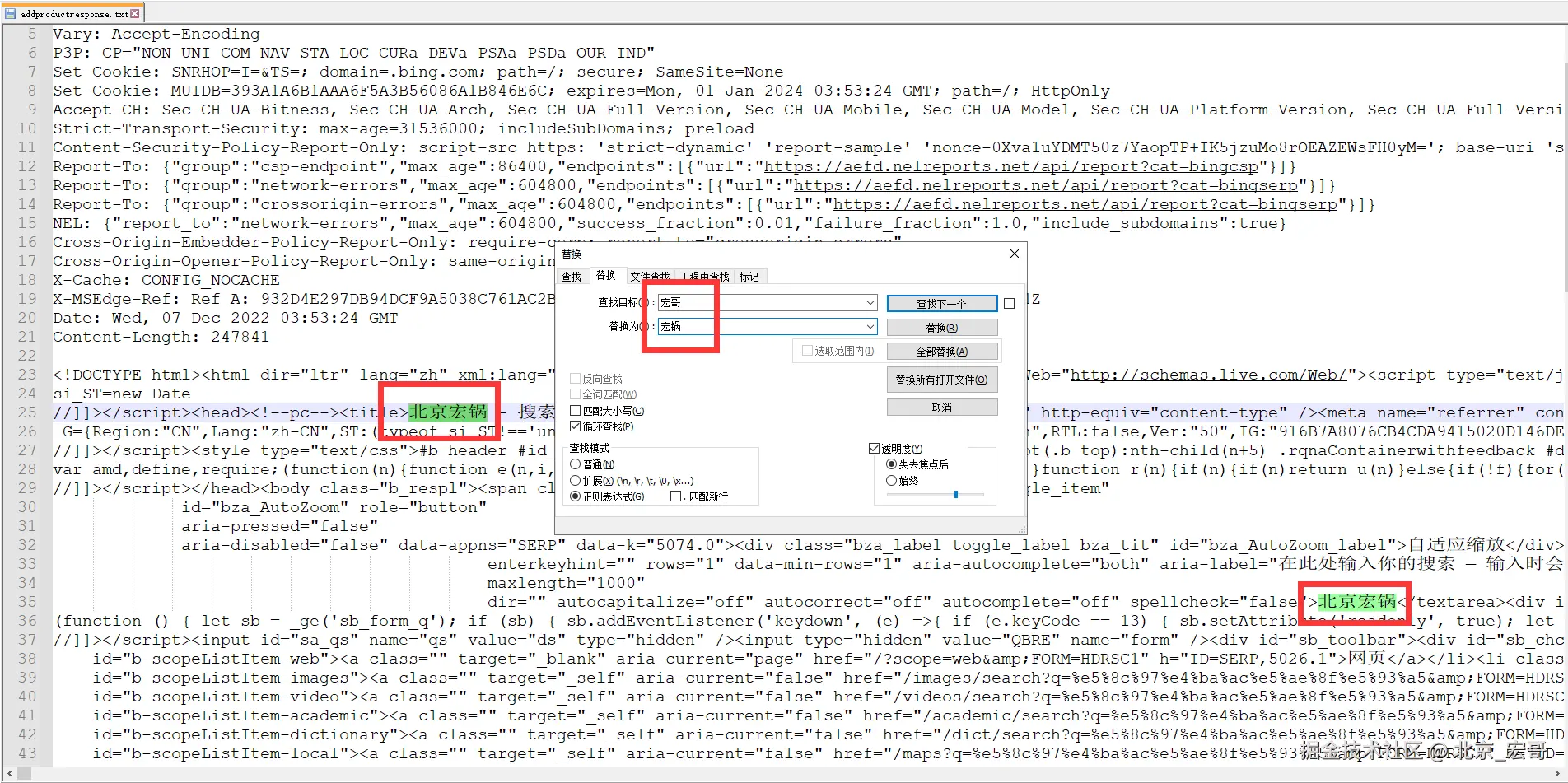 2.然后对返回包内容进行修改直接搜索“宏哥”全部替换成“宏锅”即可。如下图所示: