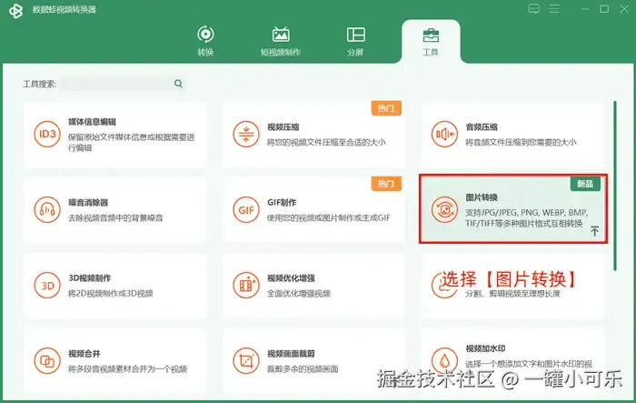 第一步:进入数据 蛙视频转换器界面,点击【工具】选项,选择其选项下的【图片转换】功能。