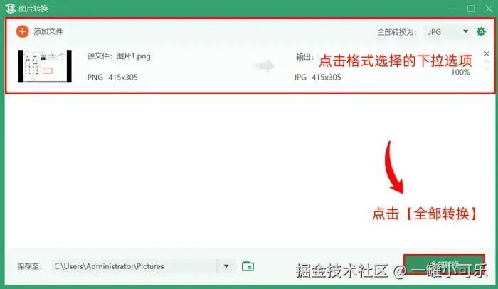 第三步:在图片格式转换界面,点击格式选择的下拉选项,选择对应的图片格式,然后点击【全部转换】即可。
