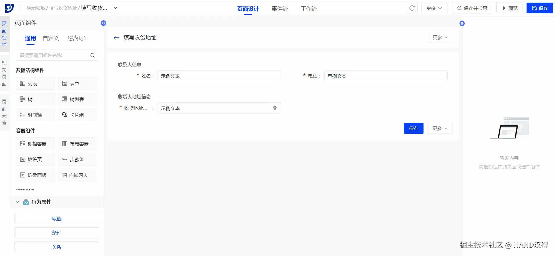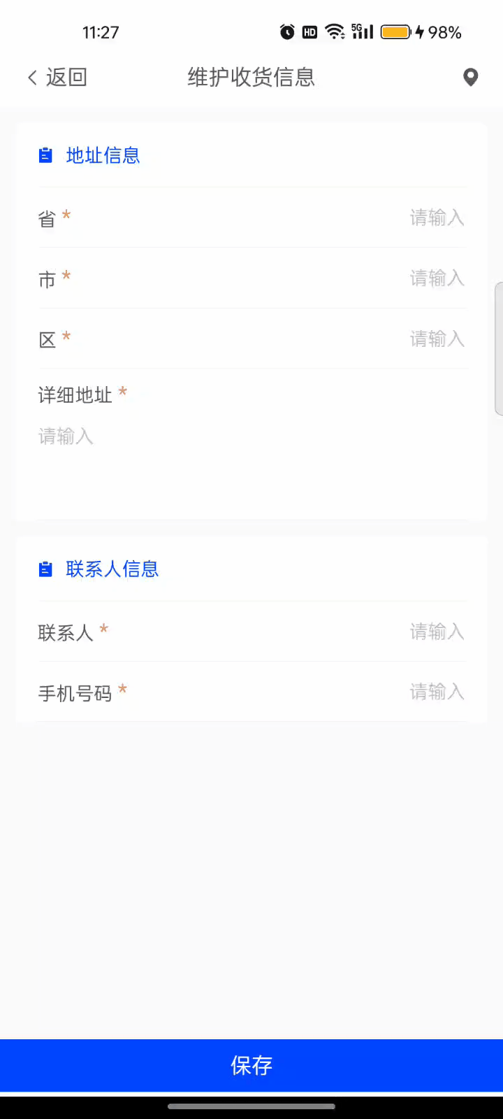 - 可以使用收货地址表单、保存按钮等组件搭建收货地址维护页面,使用地图字段默认的打开地图的功能即可完成地址信息的维护。
