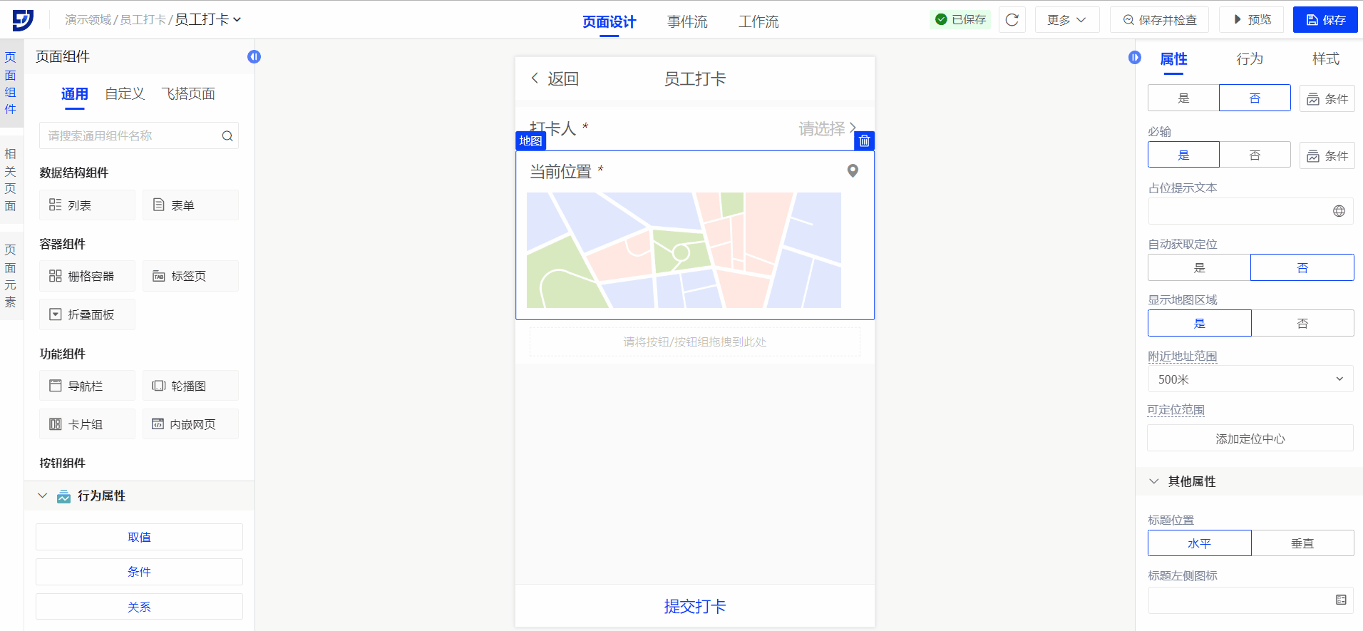 首先可以使用打卡记录表单、打卡按钮等组件搭建员工打卡页面,再配置地图组件相关的功能,步骤如下: