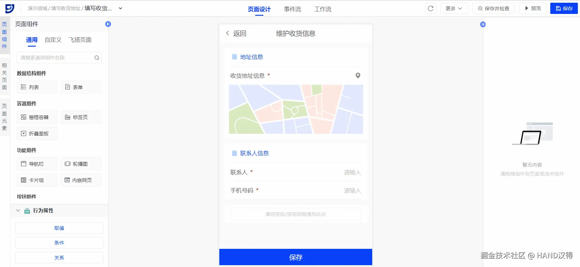 首先可以使用收货地址表单、保存按钮、定位按钮等组件搭建收货地址维护页面,然后再配置地图组件相关的功能,配置逻辑如下: