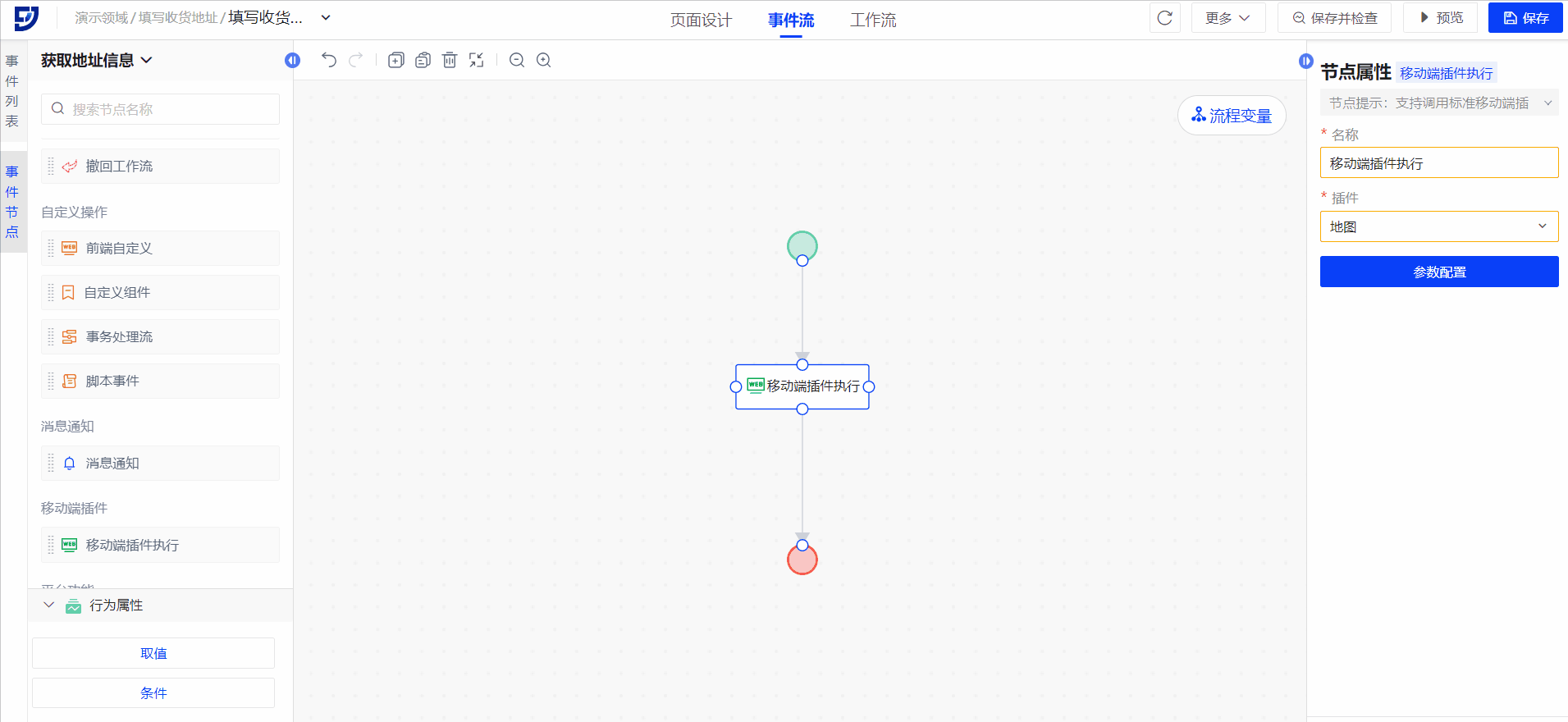 - 使用移动端插件执行节点的地图插件,将地图中所选坐标点的地址信息出参至页面字段。