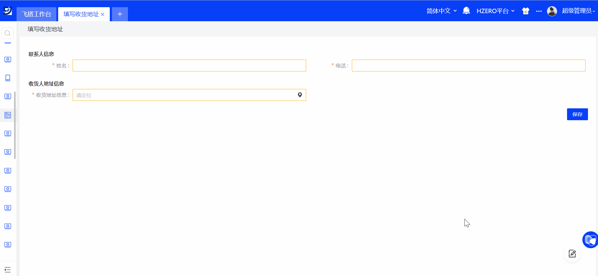 可以使用收货地址表单、保存按钮等组件搭建收货地址维护页面,使用地图字段默认的打开地图的功能即可完成地址信息的维护。