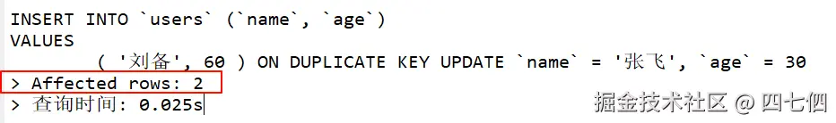 ( '刘备', 60 ) ON DUPLICATE KEY UPDATE `name` = '张飞', `age` = 30;