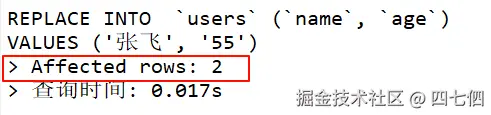 你会发现影响了两条数据(删除了原来的数据,并插入了新数据)