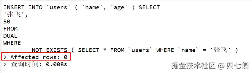 NOT EXISTS的子查询可能性能较差,尤其是在没有索引的情况下。 - 不适合并发高的场景:在高并发插入时,可能仍然出现重复数据(需要借助唯一索引等约束)。