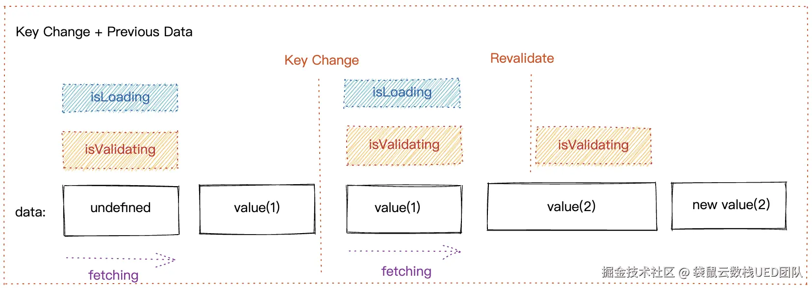 每次输入都会导致 key 变化,key 变化默认就会重新请求接口,但其实 key 变化了也就代表了数据不可信了,需要里面重置数据,因此 data 会被立即重置为 undfined 。如果新的 key 已经有缓存值,那么也会先拿缓存值进行渲染。