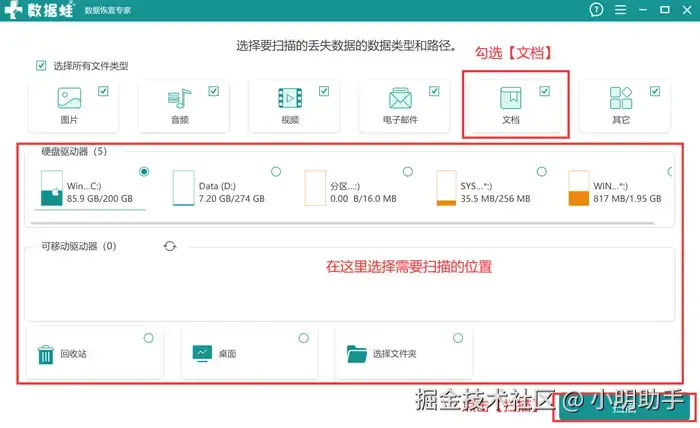 第1步: 打开数据 蛙恢复专家,然后再选择【文档】,选择丢失数据的原位置进行扫描,最后点击【扫描】;