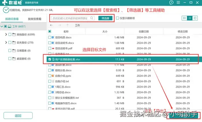 第2步: 扫描结束后选择自己需要恢复的表格文件后点击【导出】;