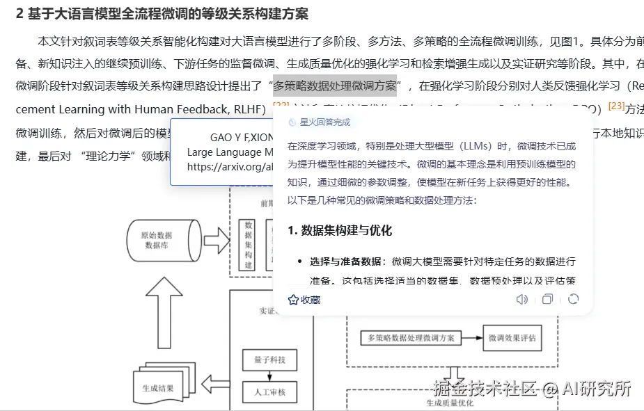 对于文中出现的专业术语如 “微调策略”“数据处理” 等,插件可快速给出准确解释。当遇到参考文献链接,能帮助查看相关文献。面对文中的复杂流程,如全流程微调的等级关系构建方案,插件能辅助理解流程逻辑,让用户在论文学习过程中更高效地掌握知识。