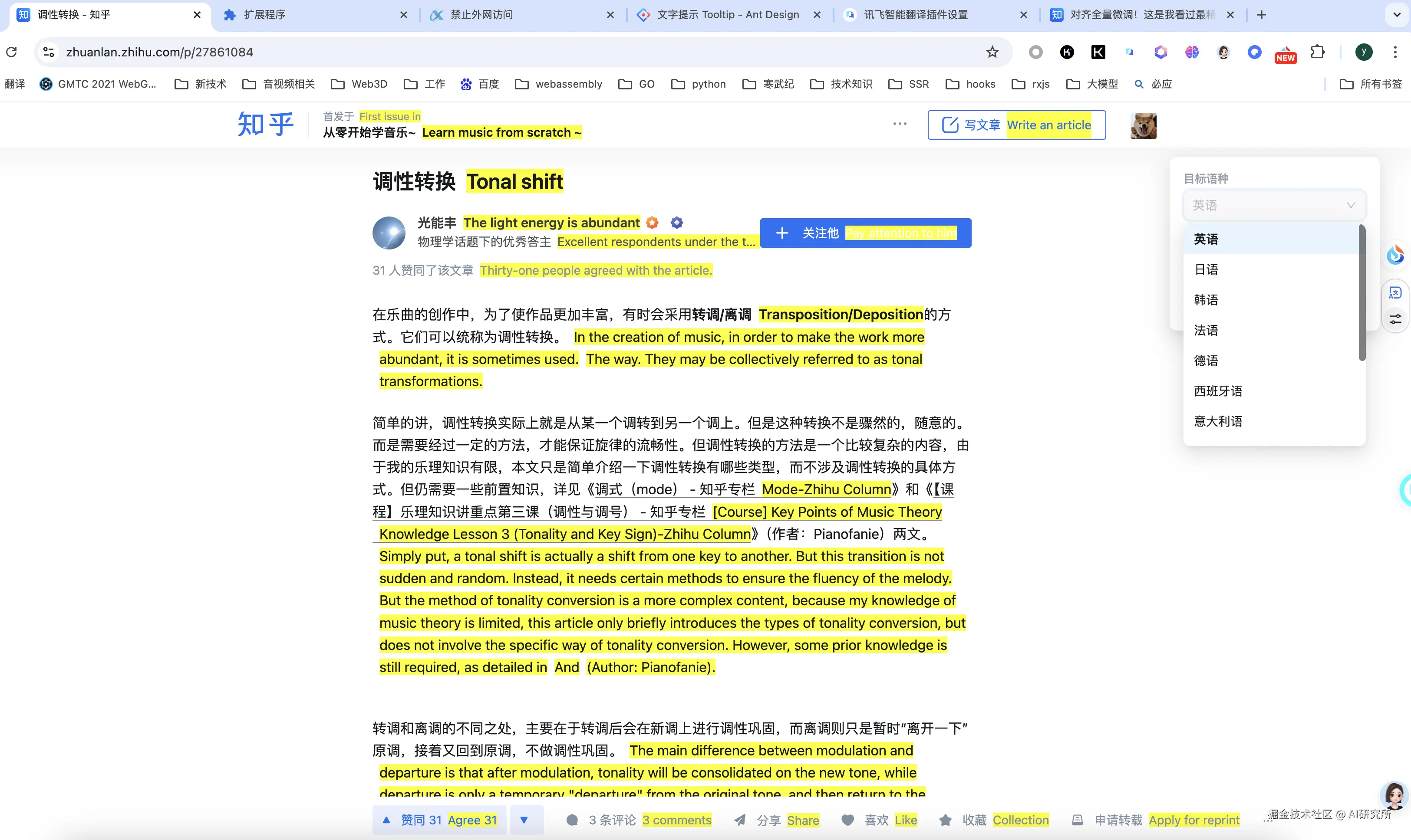 假如你阅读的是外语文章,星火插件会自动检测源语言进行一键翻译,还可手动选择俄日法韩德等其他语种的翻译结果。