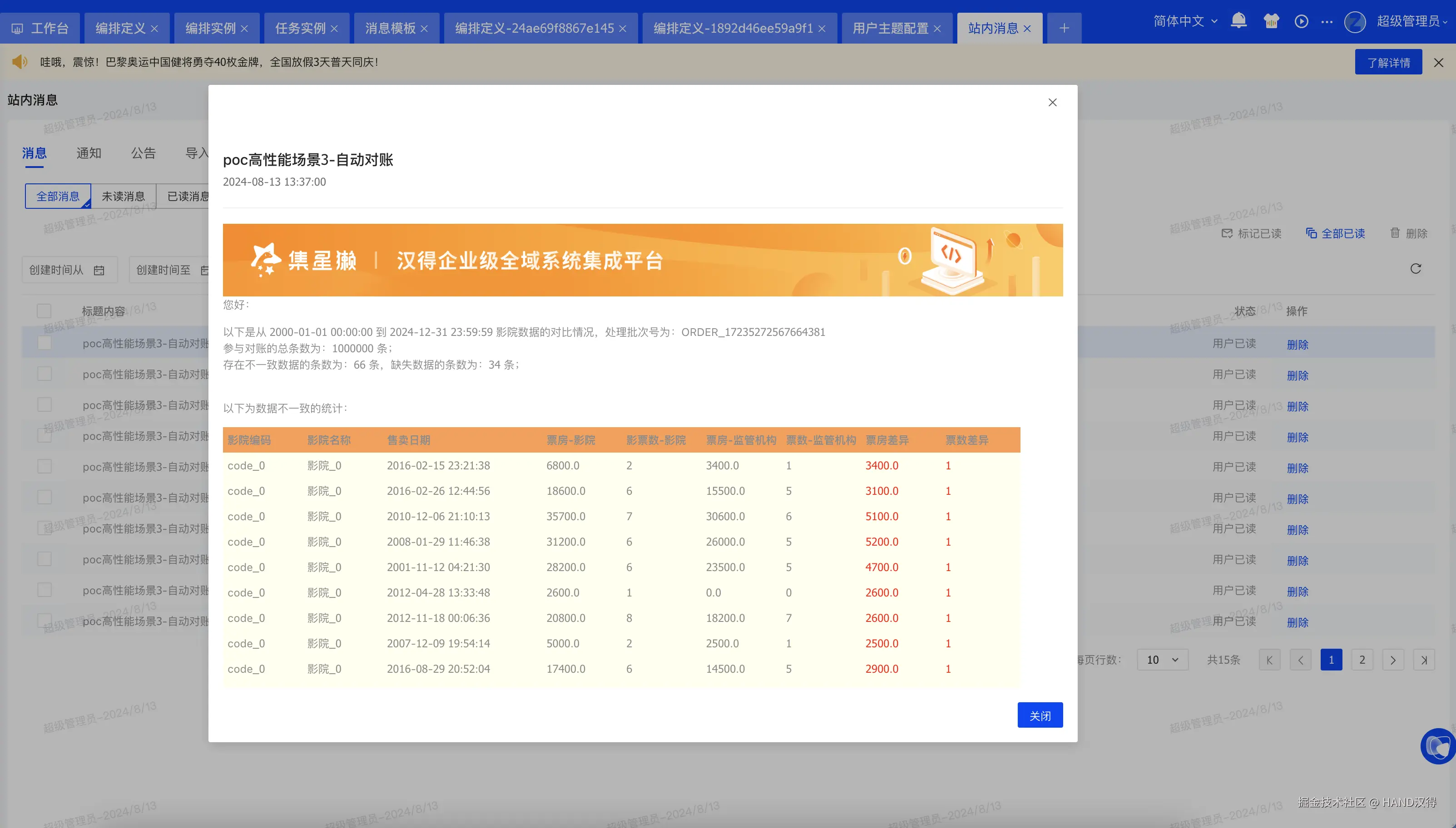 报表是执行账单核对流程后的关键输出,用户可以从报表中获取对账结果,如:差异的票房单据、缺失的票房单据、对账日期、参与对账的总单据量等信息。该报表可以通过站内信、邮件、企业微信、钉钉等市面上常见的通讯方式通知相应的人员。
