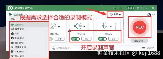 步骤1:启动软件根据需求选择合适的录制模式,接着,调整音频、摄像头等设置。点击【REC】按钮,即可轻松记录屏幕上的精彩瞬间。