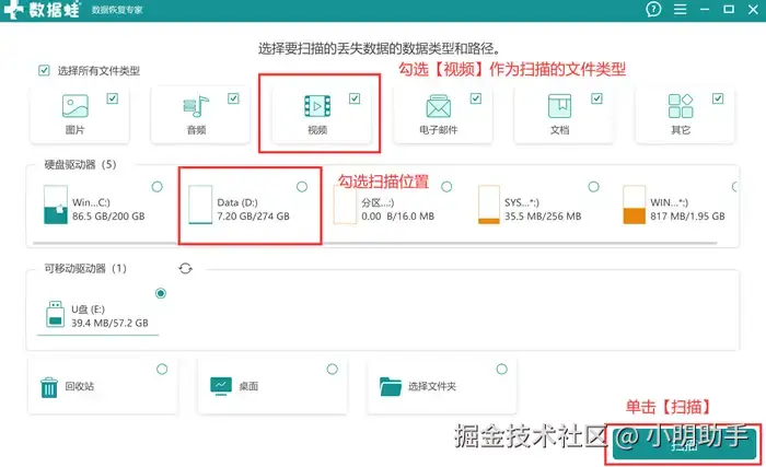 怎么找回自己删除的视频?使用数据 蛙恢复专家找回删除的视频的操作演示如下: