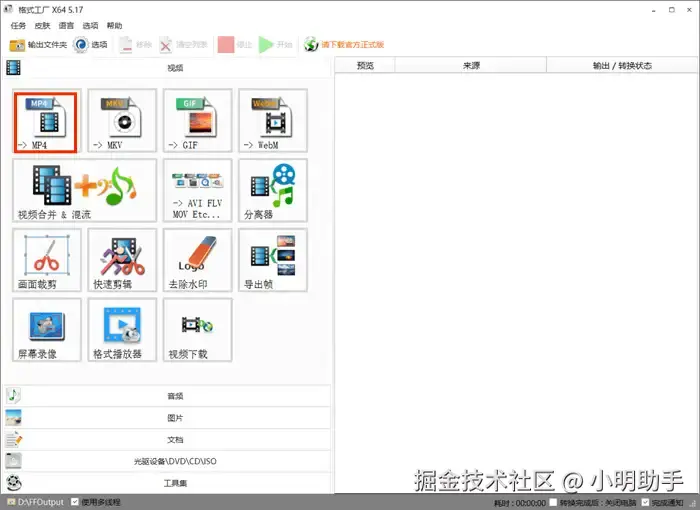 除了数据 蛙视频转换器之外,也有一些比较有代表性的视频转换软件,格式工厂就是其中一款,虽然它的转换速度、转换质量以及个性化选项丰富程度比起数据 蛙视频转换器稍有不如,但用来将mov转mp4格式还是比较实用的。下面是格式工厂的简要操作步骤: