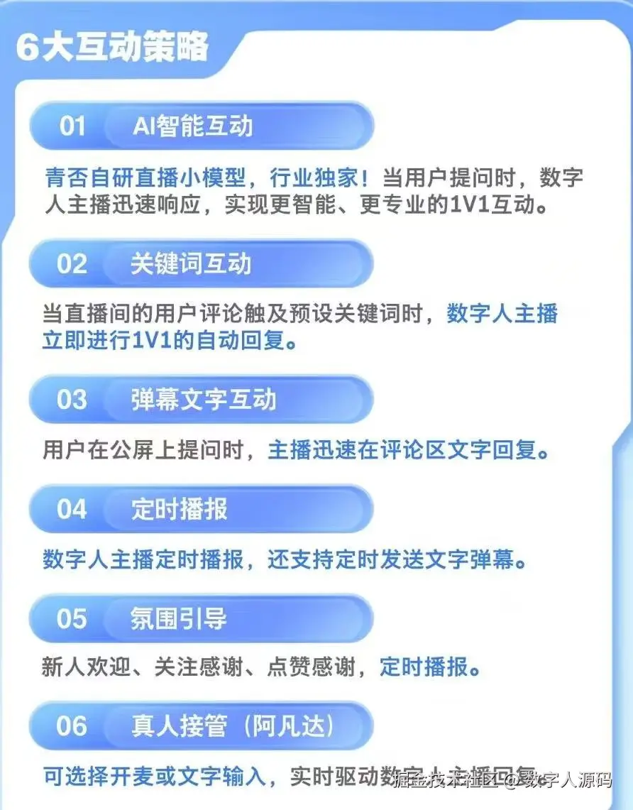 AI互动数字人主播不仅与真人无异,还可以与直播间的观众实时互动,支持6大类型AI互动。