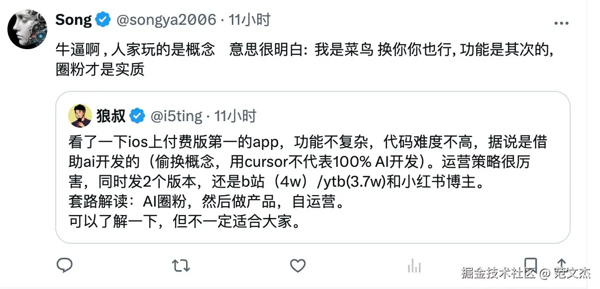 模型能力和开发体验二手抓,但模型能力是个不确定性的事儿,可能需要有人探索出来,完全自研路就非常长。而体验是当下最容易实现的,比如性能,之前 豆包 MarsCode打开文件过多就会慢,他们快速搞定,性能可以说行业里top3了。