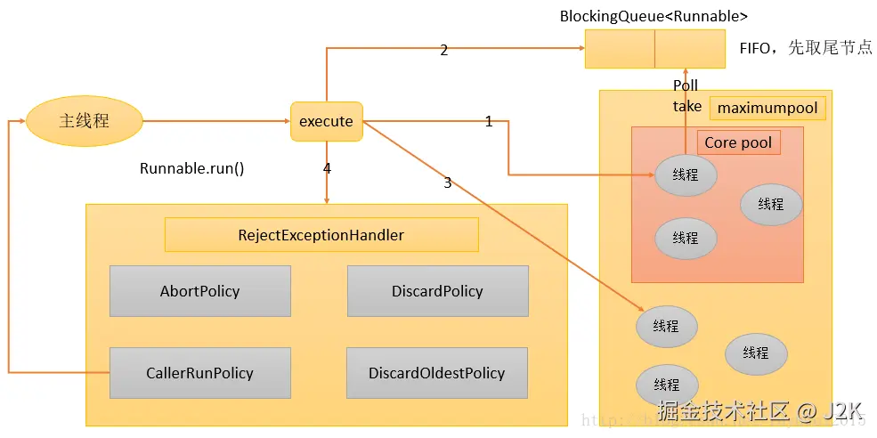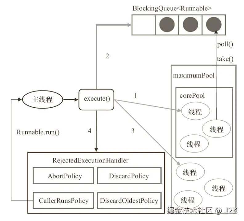 在上述代码中,当执行到 pool.shutdown() 后,线程池进入了关闭流程,不再接收新任务了,此时再去提交新任务就会被拒绝,可能会抛出 RejectedExecutionException 异常。
