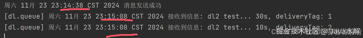 结果俩条信息都过了30s才接收到,并不符合我们的预期