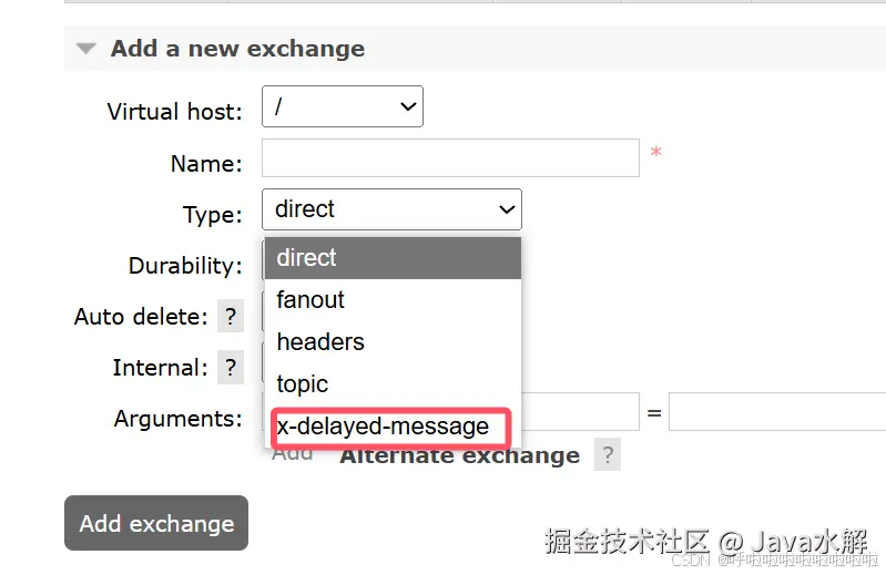 return ExchangeBuilder.directExchange(Constants.DELAY_EXCHANGE).delayed().build();