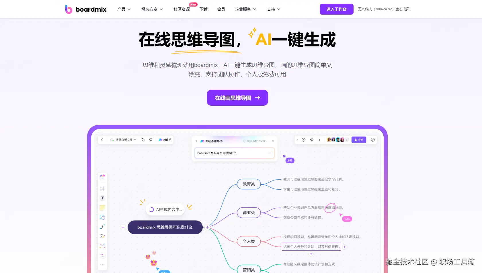 boardmix 是一款前沿的 AI 辅助思维导图软件,它提供了一整套功能来优化思维导图的制作过程。这个工具以其易用的界面和强大的人工智能功能而著称。