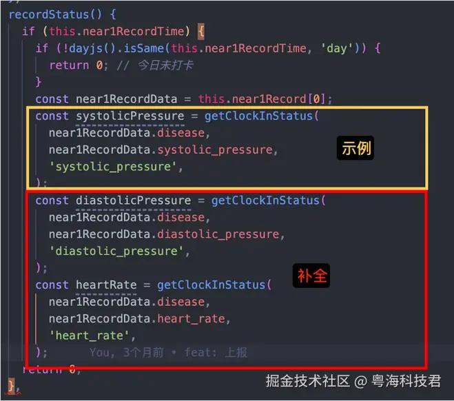 在一些具体的业务场景中,可能会由于上下文过少,导致模型难以准确的推导后续代码,这是补全时给出的代码不是研发想要的。比如下面这个业务,上下文只是简单的定义了是否存在打卡记录,没有具体的业务逻辑,这种情况下,生成的代码就会很随机。