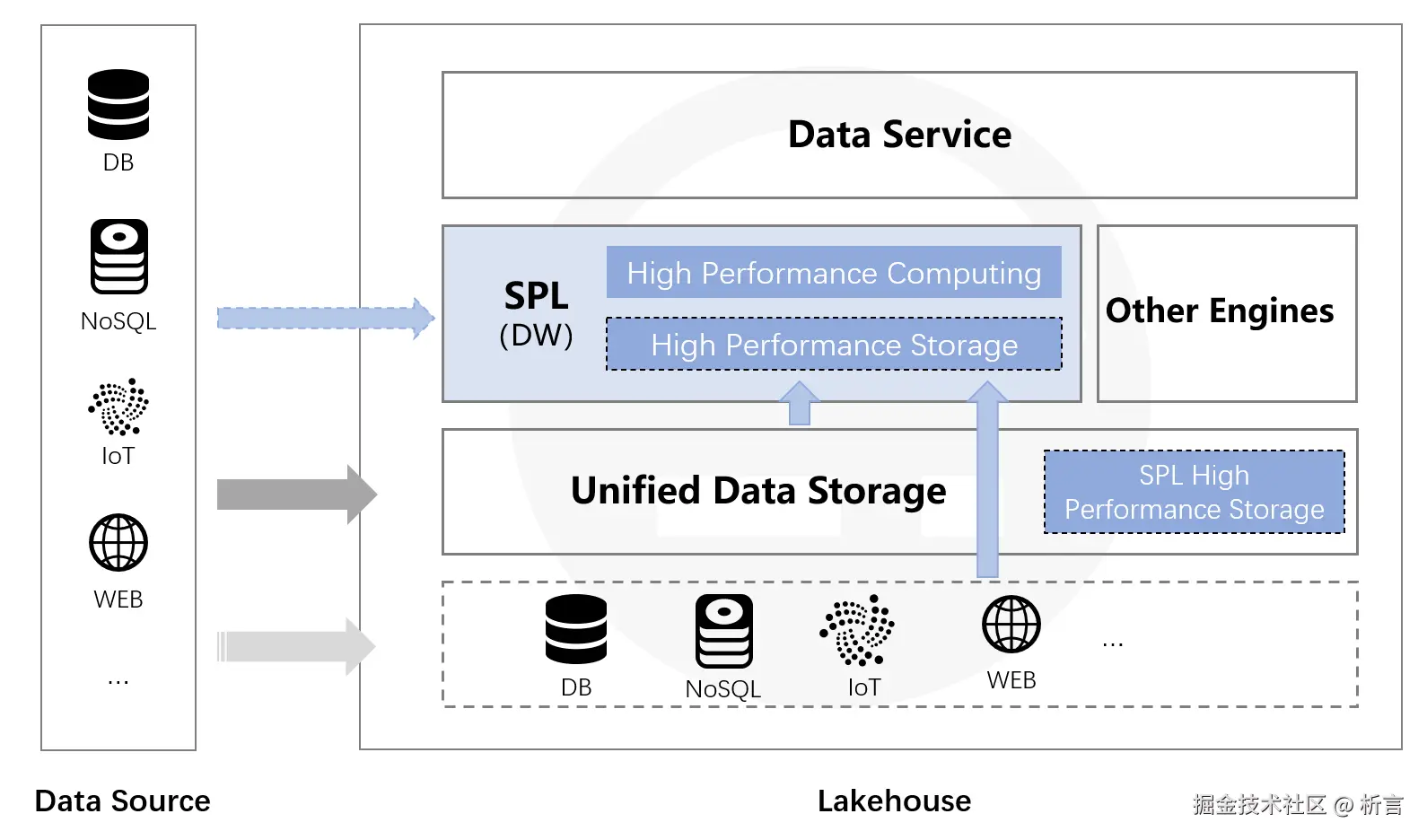 开源 SPL 就是这样一个可应用在数据湖中提供开放计算能力的结构化数据计算引擎。可以针对数据湖的原始数据直接计算,没有约束,无需“入库”。同时 SPL 还提供了多样性数据源混合计算的能力,无论数据湖使用统一文件系统构建,还是基于多样性数据源(RDB、NoSQL、LocalFile、Webservice)使用 SPL 都可以直接混合计算,快速输出数据湖价值。此外,SPL 还提供了高性能文件存储(数仓的存储功能),在 SPL 实施计算的同时,整理数据可以从容不迫地进行,将原始数据整理到 SPL 存储中可以获得更高性能。这里尤其注意的是,使用 SPL 存储整理后数据仍然存放在文件系统中,理论上可以与数据湖存放一处,这样可以实现真正意义的湖仓一体。