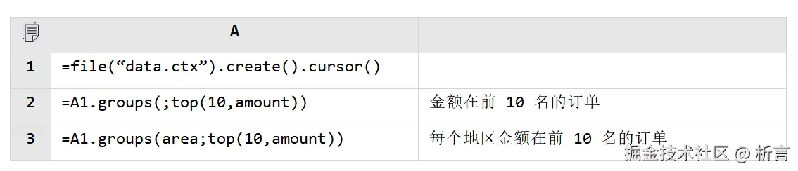 这里的语句中没有排序字样,也不会产生大排序的动作,在全集还是分组中计算 TopN 的语法基本一致,而且都会有较高的性能,类似的算法在 SPL 中还有很多。