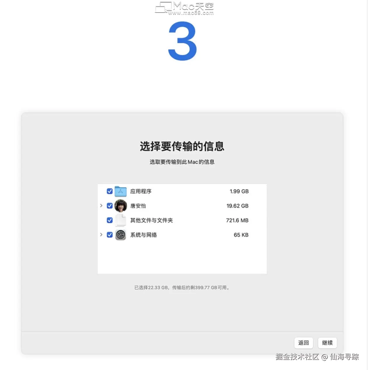 在新 Mac 上选择要传输的信息,并点按继续,开始传输。