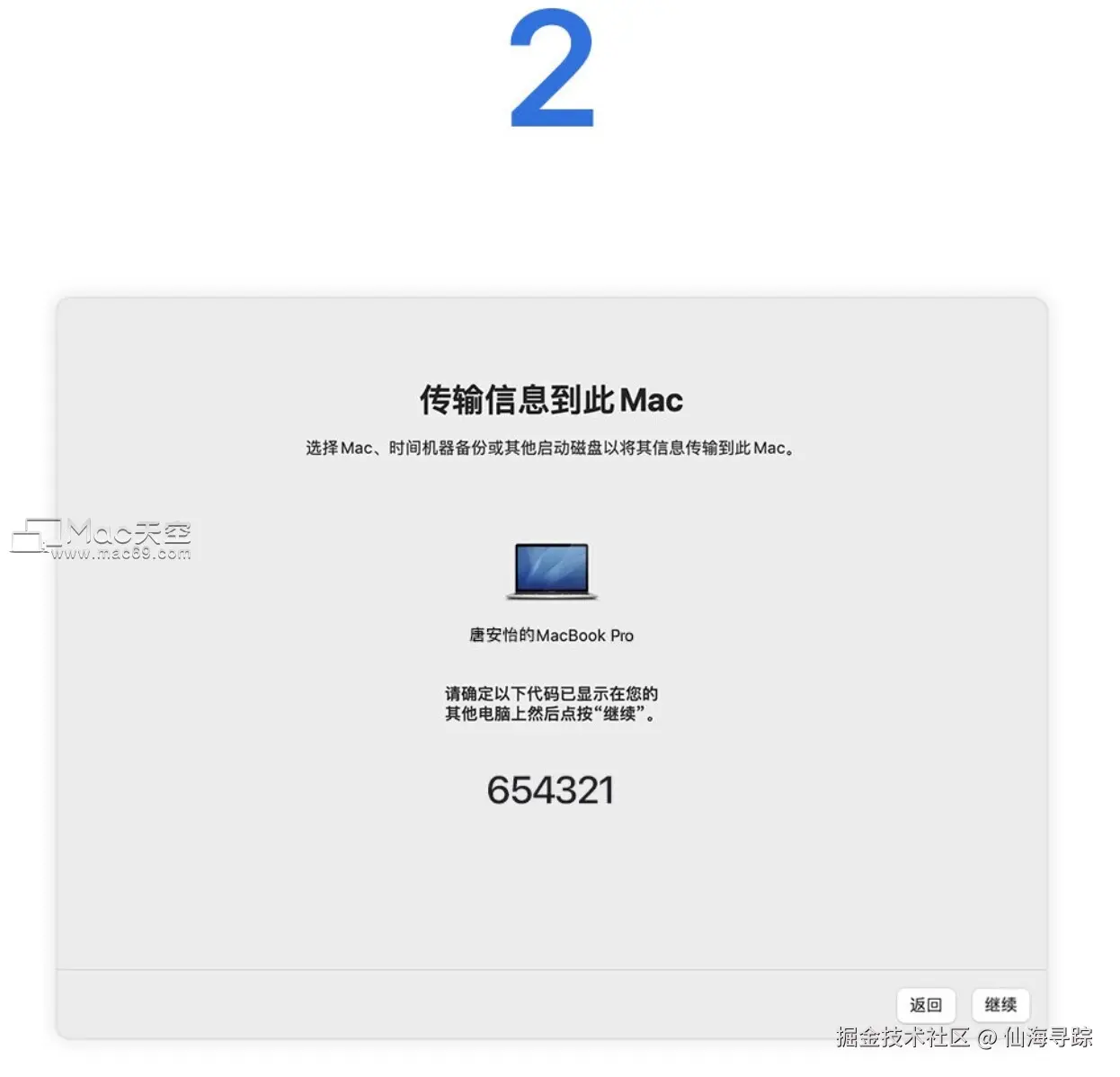 确保新 Mac 上显示的安全码与旧设备上的相同并点按继续。