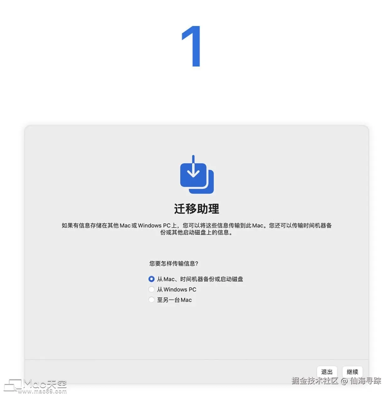 在新 Mac 上选择从 Mac、时间机器备份或启动磁盘,并点按继续。当系统再次提示你选择时选择另一 Mac。