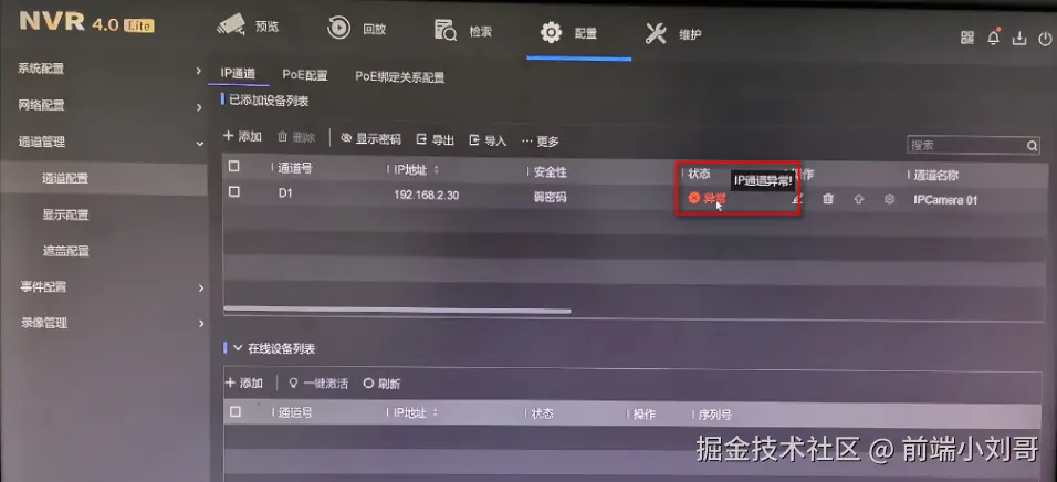 2、检查摄像机IP是否与局域网其他设备IP冲突。可以在配置—通道管理—通道配置—IP通道,先删除提示“IP通道异常”的设备,再选中已删除的设备,点击“编辑”修改设备IP地址最后一位(或将摄像机断电重启)后重新添加。