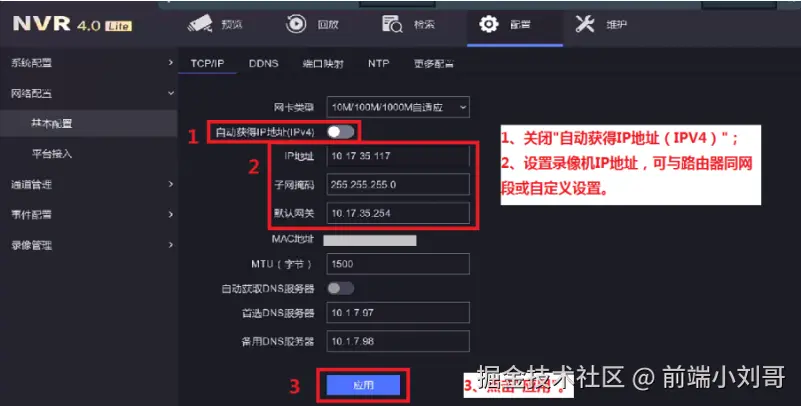 2、设置录像机IP地址,可与路由器同网段或自定义设置;