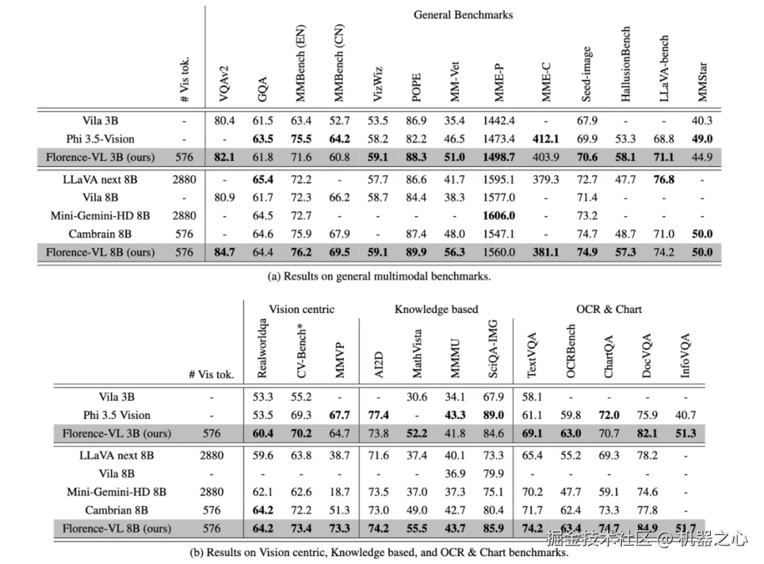 在实验结果中,Florence-VL 在多个多模态基准任务上展现出卓越的性能优势。特别是在 TextVQA 和 OCR-Bench 等文本提取任务上,得益于 Florence-2 生成式视觉编码器提供的细粒度 OCR 特征。此外,在通用视觉问答任务,视觉主导任务,知识密集型任务中,Florence-VL 通过深度 - 广度融合策略有效结合了多层级、多任务视觉特征,使得整体准确率相比传统 CLIP-based 方法有所提升。